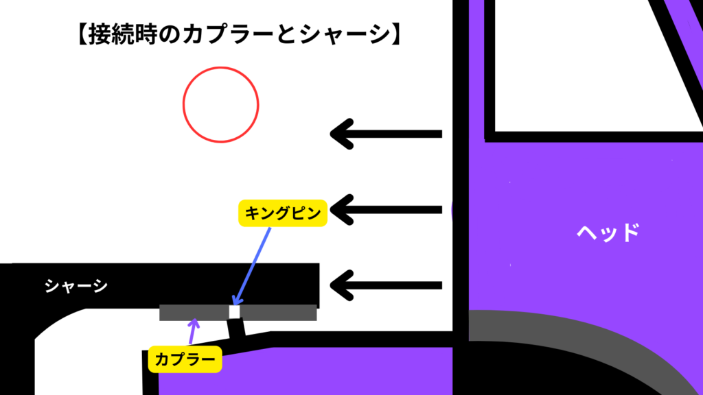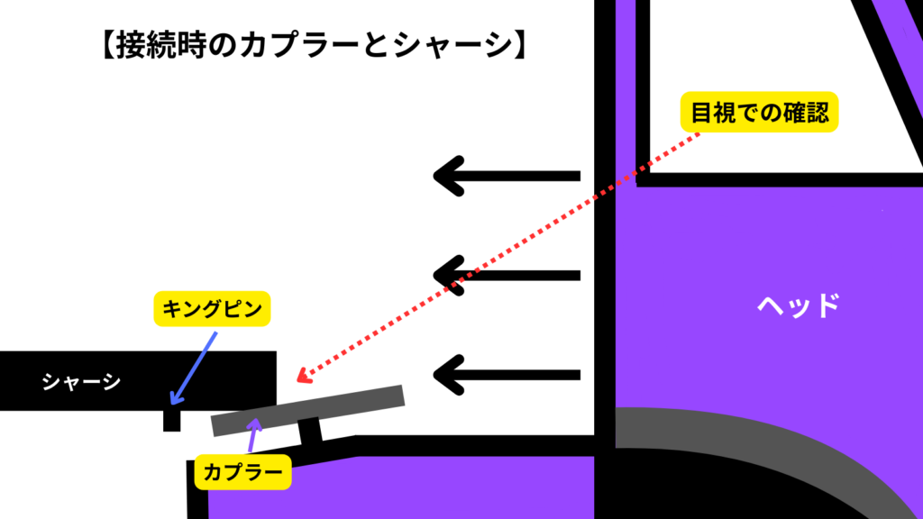 シャーシ連結時のやってしまいがちな事故の例として、高切りしている事に気付かずに、キングピンがカプラーを通り越してしまい、ヘッドのテールとシャーシが接触し、ヘッドのテールが破損してしまう事です。