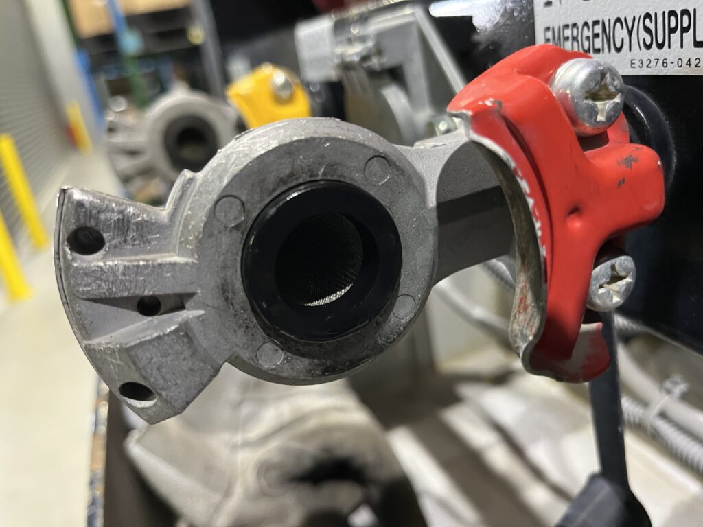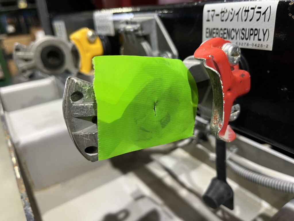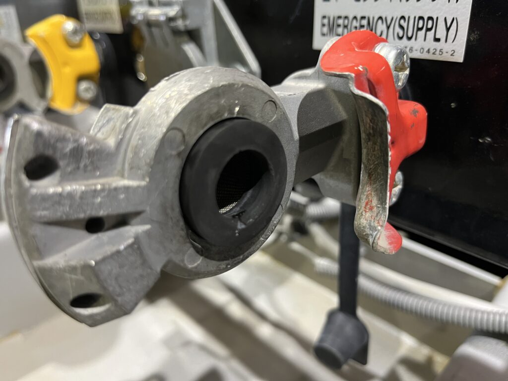 トレーラーヘッドをシャーシに連結し、エアーホースを繋ぐと「シュ〜ッ…」っとエアーが漏れてくる。