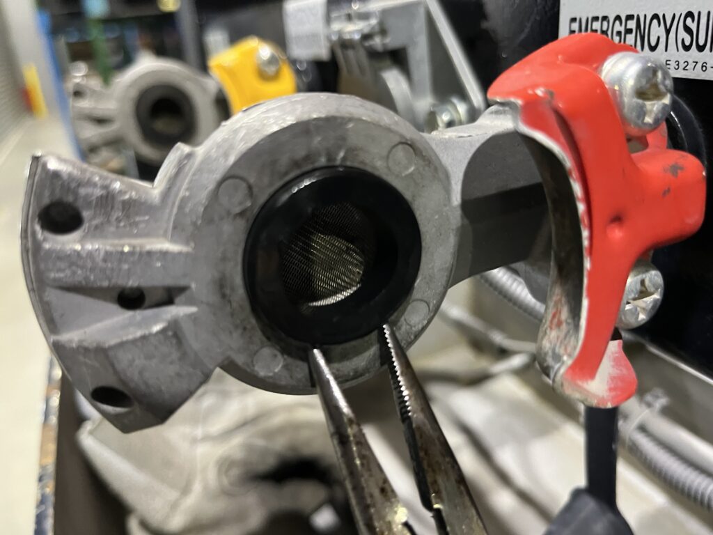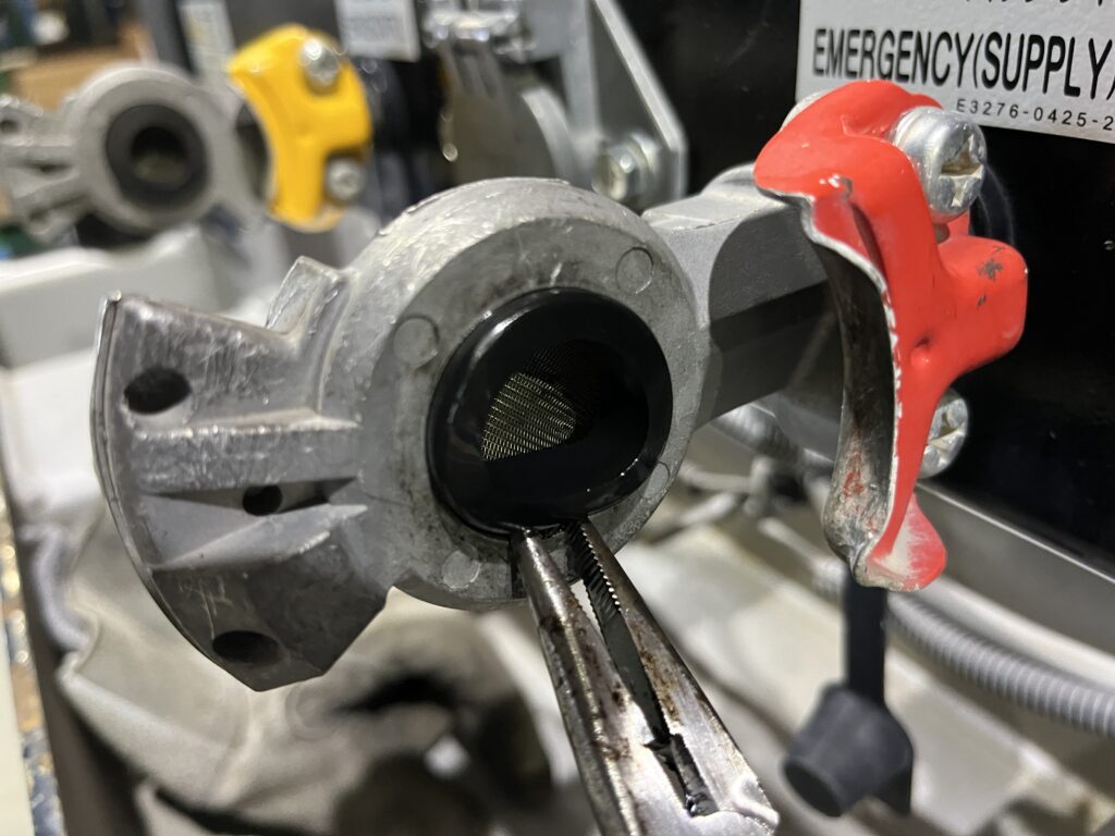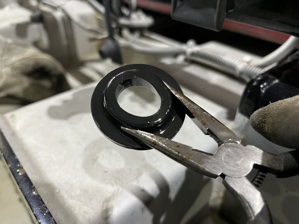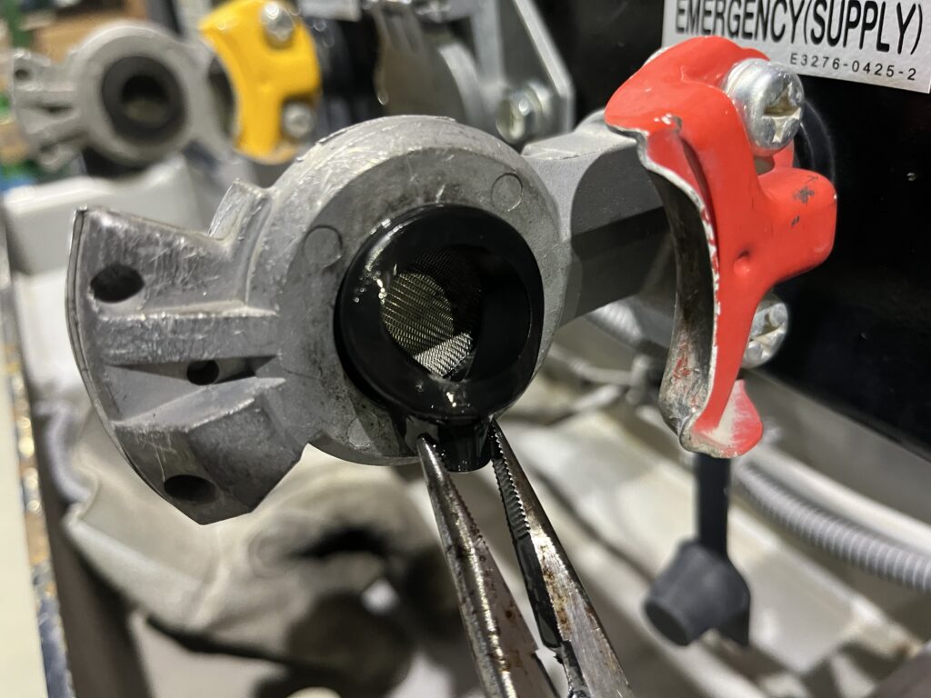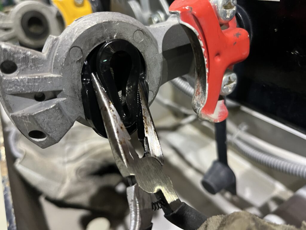 まず、エアカップリングに元々付いているダメになった詰めゴムを、ラジオペンチを使って取り出します。